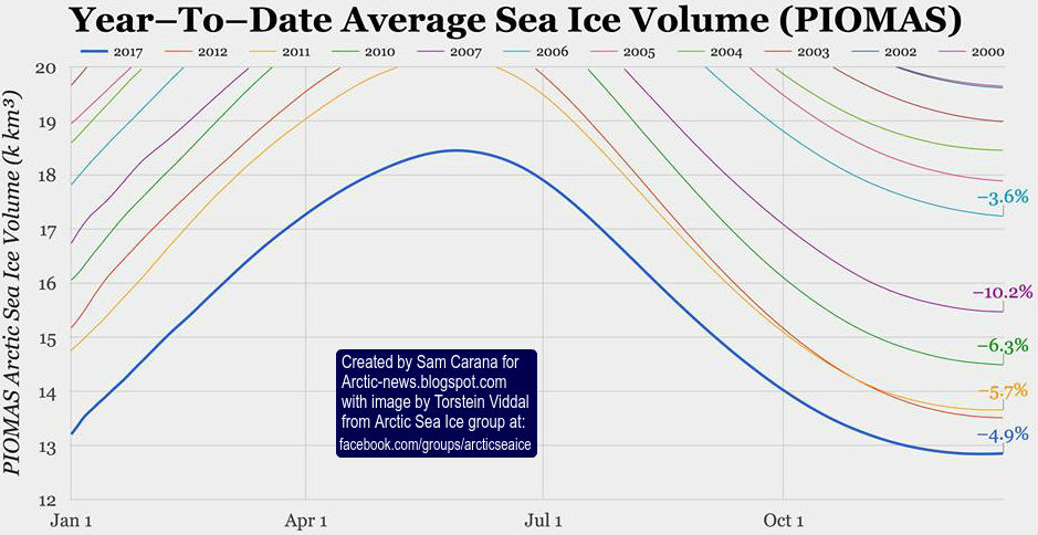 The image below shows the average year-to-date Arctic sea ice volume (PIOMAS data).